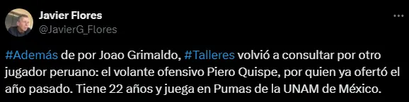 Según el periodista, Javier Flores, Piero Quispe estaría siendo seguido por Talleres de Córdoba. "#Además de por Joao Grimaldo, #Talleres volvió a consultar por otro jugador peruano: el volante ofensivo Piero Quispe, por quien ya ofertó el año pasado. Tiene 22 años y juega en Pumas de la UNAM de México", fue lo que dio a conocer mediante las redes sociales, por lo que podría ser una interesante apuesta para el mediocampista nacional.