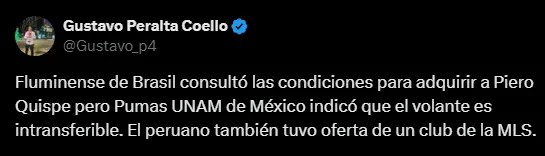 El joven volante peruano, Piero Quispe, sigue despertando el interés de clubes importantes en el extranjero. A su ya conocida calidad futbolística, se suma su participación en la selección peruana, lo que lo ha convertido en un jugador muy cotizado. En esta ocasión, el periodista Gustavo Peralta Coello informó en sus redes sociales que el Fluminense de Brasil consultó por las condiciones para adquirir al jugador, pero Pumas UNAM de México, club dueño de su pase, lo declaró intransferible. Además, se supo que Quispe también tuvo una oferta de un club de la MLS.