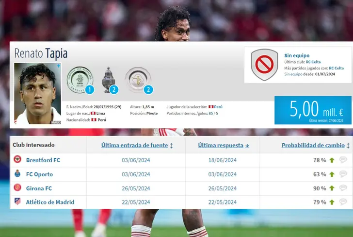 Según el reconocido portal especializado 'Transfermarkt', podemos ver que Renato Tapia tiene 4 candidatos para continuar con su carrera deportiva. Hablamos de Brentford FC de Inglaterra, FC Oporto de Portugal, Girona FC y Atlético de Madrid de la Liga Española. Veremos cómo se mueve lo que resta del mercado de fichajes en Europa o en todo caso si es que el volante tiene la intención de probar suerte en Sudamérica.