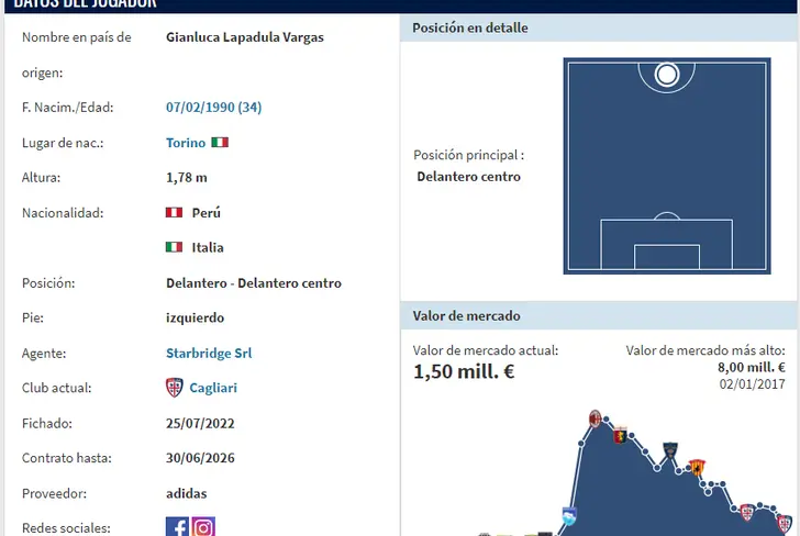 Según la web especializada 'Transfermark', Gianluca Lapadula tiene un valor internacional de 1,5 millones de euros, lo que al cambio de la moneda peruana daría un promedio cercano a los 6 millones. Es muy probable que con el correr de los años dicho precio empiece a decaer, peor aún si el delantero llega a la Serie B de Italia, aunque a estas alturas de su carrera lo que debería priorizar es la continuidad y el ritmo de competencia, algo que al parecer en el Cagliari no podrá conseguir en esta temporada 2024/25.