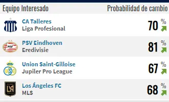 Según lo que podemos ver en Transfermarkt, son 4 los equipos interesados, el más importante es el PSV Eindhoven, el cual podría ser un importante equipo para emigrar, ya varios peruanos han llegado a este club, por otro lado, CA Talleres está muy cerca también, el cuadro argentino lo ve con muy buenos ojos, después de ello tenemos a 2 cuadros que quizás estén por debajo en nivel, tanto Los Ángeles FC como el conjunto de Union Saint-Gilloise de Bélgica.