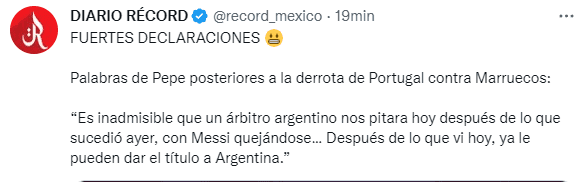 El defensor central de Portugal no tuvo problemas en manifestar su opinión, dando a entender que Argentina habría comprado el torneo para dárselo a Lionel Messi, lo cual sin duda alguna sacará mucha chispa en el vestuario argentino, que no les gusta que hablen de ellos. “Es inadmisible que un árbitro argentino nos pitara hoy después de lo que sucedió ayer, con Messi quejándose… Después de lo que vi hoy, ya le pueden dar el título a Argentina", expresó el jugador tras la derrota ante Marruecos.
