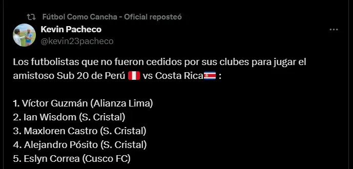 “Los futbolistas que no fueron cedidos por sus clubes para jugar el amistoso Sub 20 de Perú vs Costa Rica: Víctor Guzmán (Alianza Lima), Ian Wisdom (S. Cristal), Maxloren Castro (S. Cristal), Alejandro Pósito (S. Cristal) y Eslyn Correa (Cusco FC)”; informó el reconocido comunicador deportivo Kevin Pacheco a través de su cuenta de twitter en señal de los nombres que no se sumarán a los entrenamientos de la Bicolor cuando en el papel deberían ser claves para el proyecto de José Guillermo del Solar.