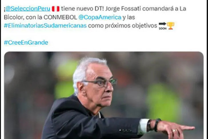 “"¡La Selección Peruana tiene nuevo DT! Jorge Fossati comandará a La Bicolor, con la Conmebol Copa América y las Eliminatorias Sudamericanas como próximos objetivos"; fue la más publicación del ente máximo del fútbol sudamericano a través de sus diversas redes sociales dando un claro mensaje de cálido recibimiento a un profesional recontra reconocido a nivel continental y que ha tenido jornadas muy buenas, lo cual sin duda alguna esperamos que se concreten con mucho más énfasis ahora que será el mandamás del equipo de todos. Apuesta en Betsson a los partidos de las mejores ligas del mundo y recibe un bono de bienvenida de 50 soles