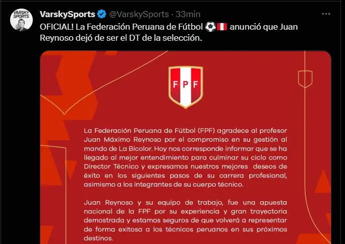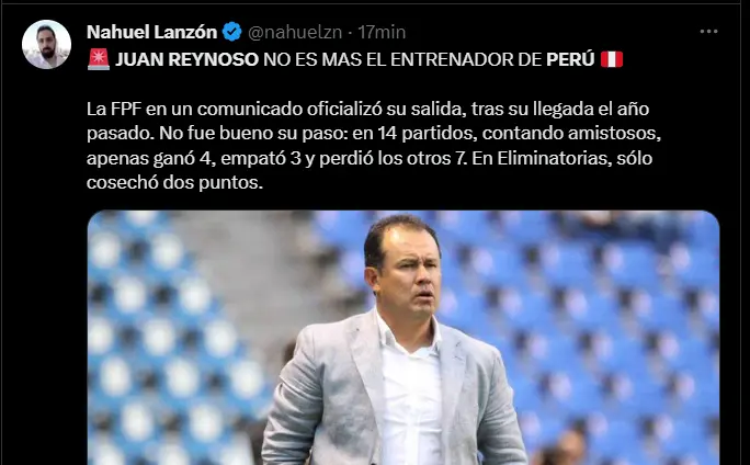 “OFICIAL. La Federación Peruana de Fútbol anunció que Juan Reynoso dejó de ser el DT de la selección”; fue el comentario que compartió el reconocido comunicador Juan Pablo Varsky a través de sus redes sociales. “JUAN REYNOSO NO ES MAS EL ENTRENADOR DE PERÚ. La FPF en un comunicado oficializó su salida, tras su llegada el año pasado. No fue bueno su paso: en 14 partidos, contando amistosos, apenas ganó 4, empató 3 y perdió los otros 7. En Eliminatorias, sólo cosechó dos puntos”; informó el periodista internacional Nahuel Lanzón.