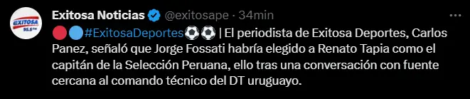 “El periodista de Exitosa Deportes, Carlos Panez, señaló que Jorge Fossati habría elegido a Renato Tapia como el capitán de la Selección Peruana, ello tras una conversación con fuente cercana al comando técnico del DT uruguayo”; fue la más reciente información brindada por el comunicador en mención durante el programa radial citado y de esta manera se confirmaría que el famoso ´Capitán del futuro´ ya no sería esperado mucho más y sería de ahora en adelante el ´Capitán del presente´ a pedido explícito del tío Fossati.