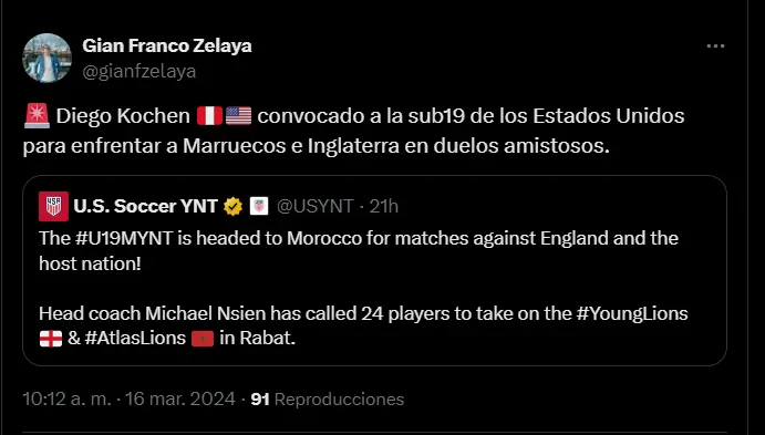 “Diego Kochen convocado a la sub19 de los Estados Unidos para enfrentar a Marruecos e Inglaterra en duelos amistosos”; fue la más información compartida por el reconocido comunicador deportivo Gian Franco Zelaya a través de su cuenta de twitter en señal de que el talentoso arquero de 17 años viene siendo muy seguido por la selección norteamericana y que poco a poco podría ir decantándose por representar dichos colores.