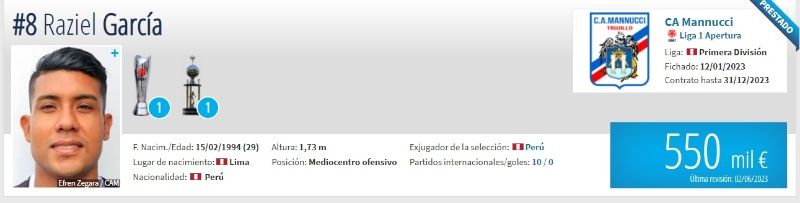 Raziel García está cotizado en 550 mil euros según reveló el portal Transfermarkt. Esta cifra al cambio en soles vendría a ser S/2,1 millones. Dueño de una calidad innegable con los pies, cerebral, buen pasador, entre otros cualidad, no le alcanza para ser convocado a la Blanquirroja. Veremos qué futuro le depara a uno de los futbolistas con mejor pie del medio local.