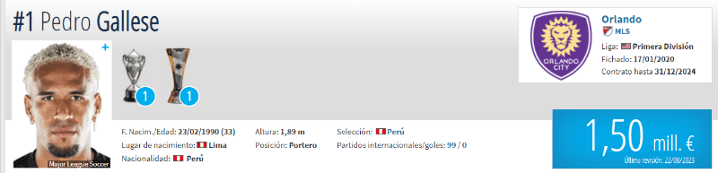El guardameta de la Selección Peruana tiene una cotización internacional en el mercado monetario de 1,5 millones de euros, lo que en soles daría un aproximado arriba de los 5,6 millones, de acuerdo al portal especializado ´Transfermarkt´. Con 33 años y un presente muy bueno en el Orlando City de la MLS de los Estados Unidos se encuentra en la consideración de ser uno de los mejores arqueros de la competición sudamericana, así que el aficionado nacional espera que pueda repetir dichas actuaciones el próximo jueves en Santiago.