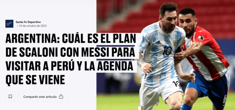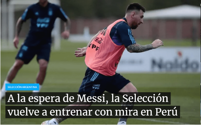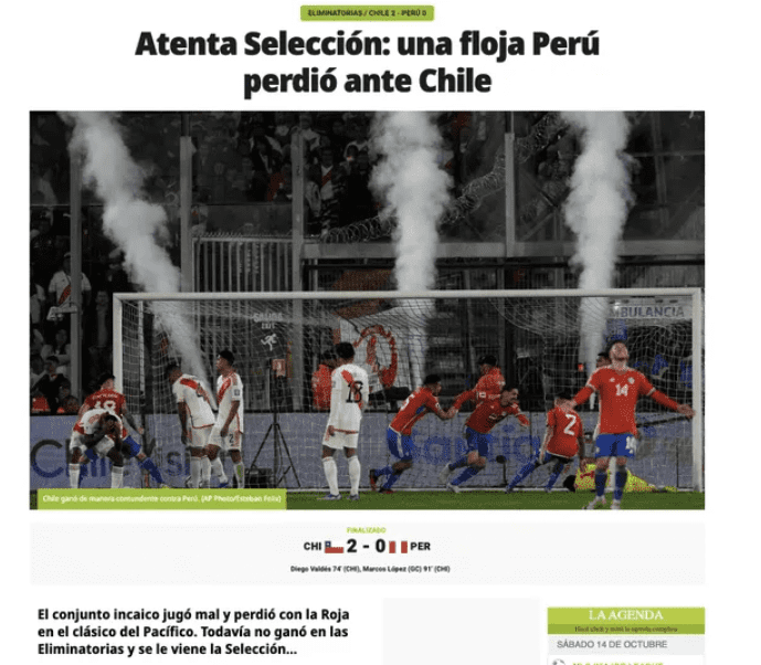 “Atenta selección, una floja Perú perdió ante Chile. El conjunto incaico jugó mal y perdió contra ´La Roja´ en el Clásico del Pacífico. Todavía no ganó en las Eliminatorias y se le viene la selección”; fue el comentario del diario ´Olé. “A la espera de Messi, la Selección vuelve a entrenar con mira a Perú”; dijo ´TyC Sports´ y “Cuál es el plan de Scaloni con Messi para visitar a Perú y la agenda que se viene”; mencionó ´OneFootball´, estos dos últimos medios albicelestes haciendo más énfasis en la posible ausencia o no del astro rosarino el próximo día martes por la noche en el Coloso de José Díaz.