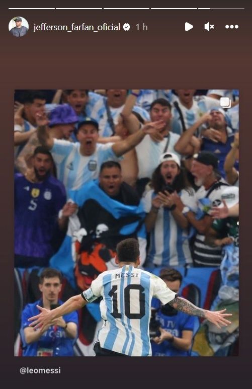 Nos referimos a Jefferson Farfán. La ‘Foquita’ subió en sus historias de Instagram un estado en el que aparece Messi festejando con la hinchada argentina tras superar con un potente remate de larga distancia la valla de Guillermo Ochoa. Recordemos que el actual delantero de Alianza Lima tuvo un fuerte cruce de palabras con Cristian ‘Cuti’ Romero en el último enfrentamiento entre Perú y Argentina por las eliminatorias Qatar 2022. El "10 de la calle" en esa ocasión sacó cara por Yoshimar Yotún luego de que Nicolás Otamendi y el mismo ‘Cuti’ se burlaron del mediocampista de Sporting Cristal tras haber fallado su penal ante ‘Dibu’ Martínez en aquel encuentro celebrado en octubre del 2021.