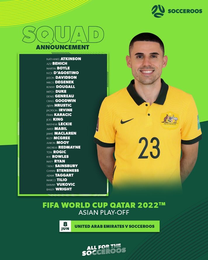 La selección australiana buscará un cupo al mundial de Qatar 2022, cuando tenga dos escollos que superar: Emiratos Árabes Unidos y Perú. Por ello el conjunto oceánico, que ya desde uno años viene jugando en la confederación asiática, publicó la lista de convocados para el repechaje.