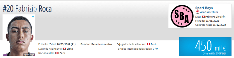 Es así como Juan Reynoso tiene un jugador en su lista que tranquilamente podría servir, estamos hablando de Fabrizio Roca, futbolista de 21 años de edad, este delantero de Sport Boys está haciendo una temporada impresionante, es por ello que el ‘cabezón’ lo llamó a la Selección Peruana, pero no se quedó con él por elegir a Raúl Ruidíaz, por lo que debería darle la oportunidad a este chico de 450 mil euros, que en soles nos da 1,7 millones según Transfermarkt.
