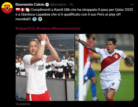 Pero esta historia es historia, ya que actualmente el club está muy feliz de contar con el 'bambino' en su equipo, ya le dieron la oportunidad de jugar nuevamente, lo cual ha hecho que el equipo levante, por esa razón no dudaron en felicitarlo por el logro conseguido con Perú. "Felicidades a Kamil Glik que le arrebató el pase a Qatar 2022, y a Gianluca Lapadula que clasificó con su Perú a los playoffs mundiales", fue el saludo del club.