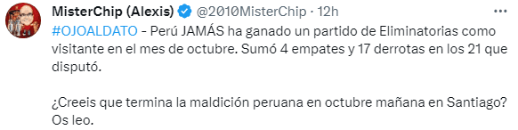 Juan Reynoso sabe que este juego es difícil, pero más aun cuando MisterChip aparece con sus datos que demuestran que el partido no va a ser nada fácil. “Perú JAMÁS ha ganado un partido de Eliminatorias como visitante en el mes de octubre. Sumó 4 empates y 17 derrotas en los 21 que disputó. ¿Creeis que termina la maldición peruana en octubre mañana en Santiago? Os leo”, fue lo que publicó el popular estadístico español sobre lo que se le viene a la Selección Peruana, que pese a estar en el mes de los milagros, parece que no le ha servido de mucho. Apuesta en Betsson con una supercuota x20 por el triunfo de PERÚ ante CHILE, en el 1x2 pre-match con un máximo de S/20.