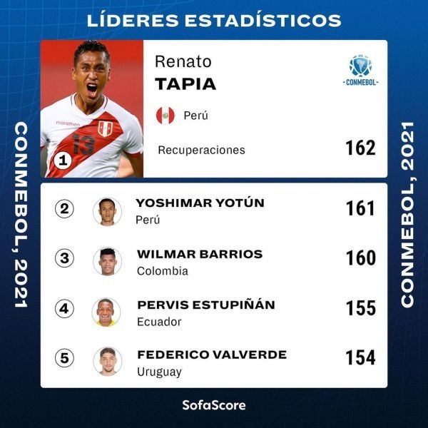 Asimismo, hay otro peruano en la lista, pues Yoshimar Yotún tiene el segundo puesto con 161 recuperaciones, siguiéndoles Wilmar Barrios con 160, Pervis Estupiñan con 155 y terminando la lista del top 5 con Federeico Valverde con 154.
