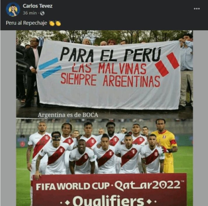 "Perú al repechaje", fue lo que señaló el ex delantero de Boca Juniors con una foto del equipo nacional y arriba de esta aparece una imagen donde que dice: "Para el Perú, las Malvinas siempre argentinas".