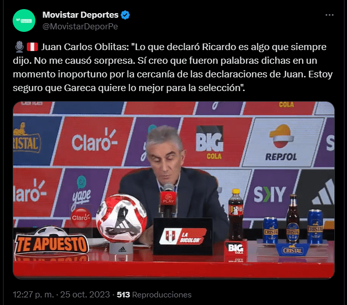 “Lo que declaró Ricardo es algo que siempre dijo. No me causó sorpresa. Sí creo que fueron palabras dichas en un momento inoportuno que parecieron desafortunadas por la cercanía del partido que habíamos tenido con Argentina y lógicamente de las declaraciones de Juan. Estoy seguro de que Gareca quiero lo mejor para la Selección Peruana”; fue el contundente comentario con el que el Director General de la Federación Peruana de Fútbol le mandó un dardo al ´Tigre´ por la forma y el contexto en el que se hizo presente tras perder 2-0 de local frente al campeón del mundo en el Estadio Nacional.