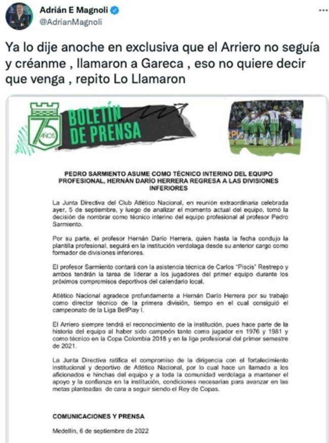 Según reveló el periodista Adrián Magnoli, Atlético Nacional de Colombia despidió a su estratega y habrían contactado al ex DT de la blanquirroja. “Ya lo dije anoche, en exclusiva, que el ‘Arriero’ no seguía. Créanme, llamaron a Gareca, eso no quiere decir que venga. Repito, lo llamaron”, precisó el comunicador en Twitter.