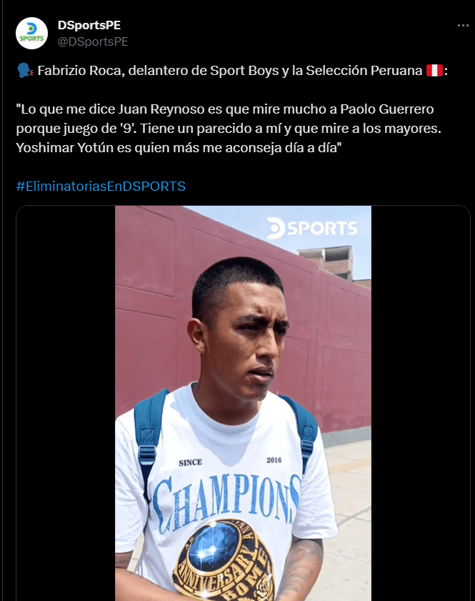 “Lo que me dice Juan Reynoso es que mire mucho a Paolo Guerrero porque juego de 9. Tiene un parecido a mí y que mire a los mayores. Yoshimar Yotún es quien más me aconseja día a día”; fueron las declaraciones del atacante del Sport Boys del Callao en referencia a las vivencias que está teniendo en estos días de arduo entrenamiento en Videna al lado de jugadores experimentados y que por obvias razones pueden aportarle muchísimo en su crecimiento, no solo como jugador de club, sino también de selección.
