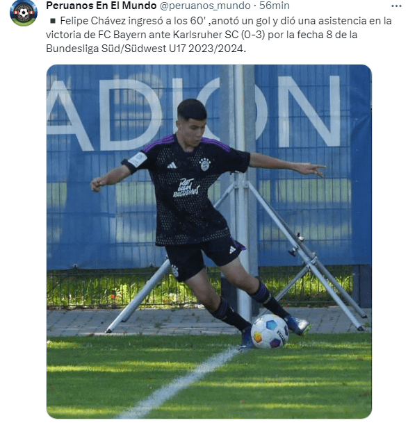 Ahora último con el cuadro de Bayern Múnich justamente estuvo jugando, consiguiendo un gran papel, así lo dio a contar la cuenta de X, Peruanos En El Mundo. “Felipe Chávez ingresó a los 60' ,anotó un gol y dio una asistencia en la victoria de FC Bayern ante Karlsruher SC (0-3) por la fecha 8 de la Bundesliga Süd/Südwest U17 2023/2024”, fue lo que publicó esta cuenta destinada a los futbolistas nacionales afuera, dando así a conocer un nuevo elemento que tranquilamente pueda servir para la Selección Peruana.