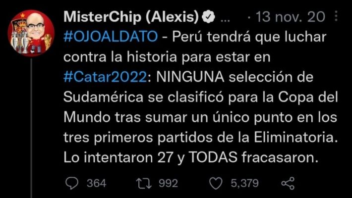Si en caso Perú juega Qatar 2022, será la primera selección en clasificarse al Mundial tras sumar un único punto en los 3 primeros partidos de la Eliminatorias. "Lo intentaron 27 selecciones y todas fracasaron", señaló el estadista español hace un par de años.