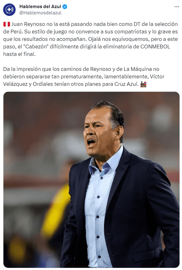 En México piensan lo mismo y una cuenta destinada a su antiguo club, el Cruz Azul, le augura un mal final con la Selección Peruana. "Juan Reynoso no la está pasando nada bien como DT de la selección de Perú. Su estilo de juego no convence a sus compatriotas y lo grave es que los resultados no acompañan. Ojalá nos equivoquemos, pero a este paso, el "Cabezón" difícilmente dirigirá la eliminatoria de CONMEBOL hasta el final", se puede leer sobre lo que está pasando con el DT nacional en estos momentos.