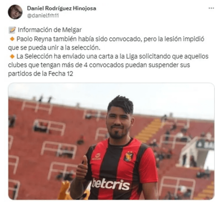 Dicha información fue revelada y compartida por el periodista Daniel Rodríguez Hinojosa, quien cubre permanentemente las diversas incidencias del cuadro characato. “Paolo Reyna también había sido convocado, pero la lesión impidió que se pueda unir a la selección”; fue el tweet que viene siendo tendencia en redes sociales al enterarnos un dato que nadie tenía.