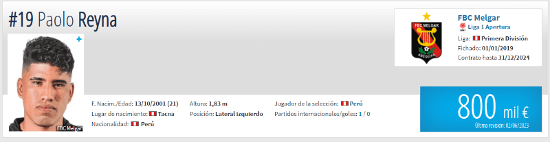 El lateral izquierdo de Melgar tiene una cotización monetaria de 800 mil euros, según la web especializada ´Transfermarkt´. Se espera que durante las siguientes jornadas del Torneo Clausura pueda reaparecer en las canchas para seguir llamando la atención del comando técnico en Videna y así tentar una posibilidad de nueva convocatoria para los demás partidos de la Blanquirroja.