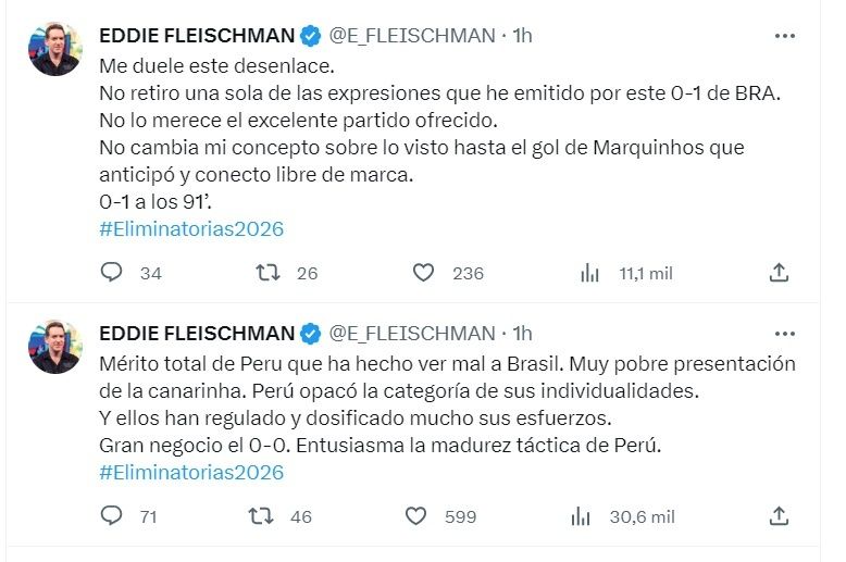 Es así como, Eddie Flesichman mostró su postura en frío en redes sociales. El periodista resaltó el juego de Perú, aunque como a la gran mayoría de peruanos, le dolió el resultado final. “Me duele este desenlace. No retiro una sola de las expresiones que he emitido por este 0-1 de BRA. No lo merece el excelente partido ofrecido. No cambia mi concepto sobre lo visto hasta el gol de Marquinhos que anticipó y conecto libre de marca. 0-1 a los 91’”, sostuvo Flesichman en Twitter.