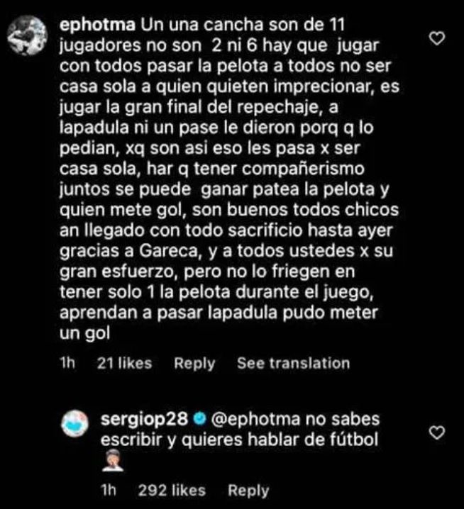 Ese es el caso de Sergio Peña, quien pese a haber tenido un desastroso partido ante Australia tuvo el momento de poder responderle a un hincha en Instagram que lo criticó por su actuación en Doha.