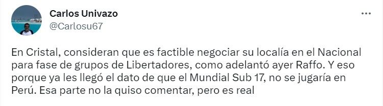 Eso sería quitarle al Perú la sede del Mundial Sub - 17, designado en un principio a realizarse en el país de los incas. Esta información la dio a conocer el periodista deportivo Carlos Univazo en sus redes sociales. “En Cristal, consideran que es factible negociar su localía en el Nacional para fase de grupos de Libertadores, como adelantó ayer Raffo. Y eso porque ya les llegó el dato de que el Mundial Sub 17, no se jugaría en Perú. Esa parte no la quiso comentar, pero es real”, afirmó el comunicador a través de su cuenta de Twitter. Con ello, la Selección Peruana en caso se confirme esta información, perdería su cupo al Mundial de dicha categoría y deberá pelear por obtener su cupo como clasificado en la cancha.
