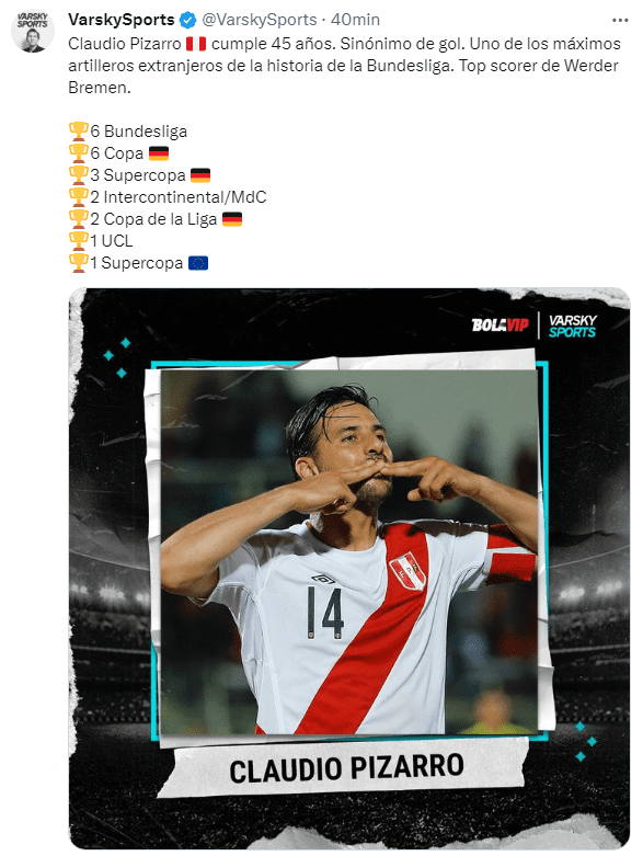 Pues justamente en el día de su cumpleaños número 45, el periodista Juan Pablo Varsky no dudó un solo minuto en hacerle un reconocimiento y esto fue lo que dijo de Claudio Pizarro en sus redes sociales: “Claudio Pizarro cumple 45 años. Sinónimo de gol. Uno de los máximos artilleros extranjeros de la historia de la Bundesliga. Top scorer de Werder Bremen”, expresó el periodista sobre lo que ha sido la carrera del peruano, por lo que también colocó todo lo que llegó a ganar, que fueron varios trofeos importantes en Alemania.