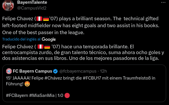 Estamos hablando de Felipe Chávez, quien es un futbolista que está marcando la diferencia en el cuadro alemán, logrando ser un gran prospecto, en el cuadro Sub 17 viene anotando hasta ahora 8 goles y ha dado 2 asistencias, algo que no muchos jugadores hacen, por lo que se ve que está destacando y al ser alemán también, deberían aprovechar para poder darle su oportunidad en el cuadro principal de la Selección Peruana, sería una gran suma para el conjunto patrio. Apuesta en Betsson a los partidos de las mejores ligas del mundo y recibe un bono de bienvenida de 50 soles