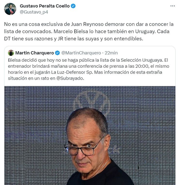 “No es una cosa exclusiva de Juan Reynoso demorar con dar a conocer la lista de convocados. Marcelo Bielsa lo hace también en Uruguay. Cada DT tiene sus razones y JR (Juan Reynoso) tiene las suyas y son entendibles”, reveló el comunicador en dicha red social. Bajo esa premisa, el periodista Martín Charquero reveló que Bielsa dará a conocer su lista de convocados el día sábado 2 de septiembre a las 18:00 (hora peruana).
