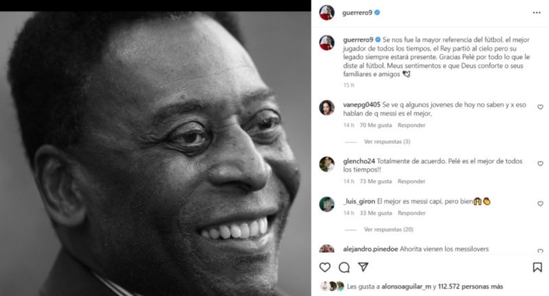 No solo fans, futbolistas de todas partes del planeta han aprovechado la oportunidad para despedirse de la leyenda del Santos. Y como era lógico, jugadores peruanos decidieron darle el último adiós en Instagram. Uno de ellos fue Paolo Guerrero, es así como el máximo goleador histórico de la Selección Peruana decidió compartir un mensaje en dicha red social, demostrando no solo empatía con la figura, sino también admiración. “Se nos fue la mayor referencia del fútbol, el mejor jugador de todos los tiempos, el Rey partió al cielo pero su legado siempre estará presente. Gracias Pelé por todo lo que le diste al fútbol. Meus sentimentos e que Deus conforte o seus familiares e amigos”, precisó el delantero nacional en un estado de Instagram.