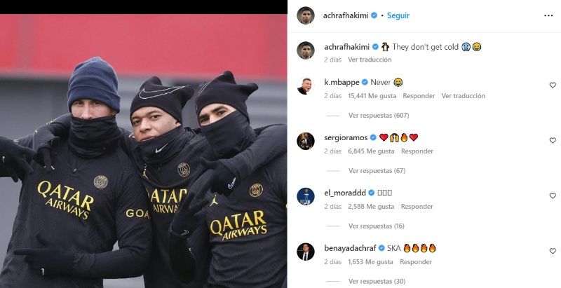 Es así como, Achraf Hakimi, uno de los futbolistas más destacados del elenco marroquí, decidió subir un estado en sus redes sociales al enterarse que enfrentará a la bicolor en marzo. El lateral derecho del PSG subió una foto en su cuenta de Instagram junto a sus compañeros Sergio Ramos y Kylian Mbappé en una sesión del entrenamiento del cuadro parisino, quitándole importancia al duelo ante la bicolor.