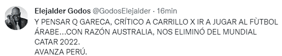 Pero al parecer el tiempo le terminó dando la contraria a Ricardo Gareca, quien sufrió seguramente como muchos argentinos, la derrota de su país en un inicio terrible en Qatar 2022. Pero quizás esto se dio por menospreciar al rival, por lo menos esto da a entender el comunicador en un polémico mensaje que dejó en redes. “Y pensar que Gareca, criticó a Carrillo por ir a jugar al fútbol árabe… con razón Australia nos eliminó del Mundial Catar 2022”, fue el crítico comentario del hombre de prensa, que siempre ha sido bastante crítico con el exDT de la Selección Peruana.