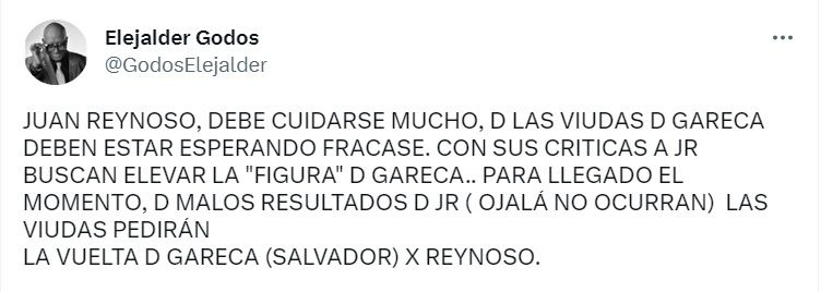 “Juan Reynoso, debe cuidarse mucho de las viudas de Gareca. Deben estar esperando que fracase, con sus críticas a Juan Reynoso buscan elevar la figura de Gareca…para llegado el momento, de malos resultados de Juan Reynoso (ojalá no ocurran) las viudas pedirán la vuelta de Gareca (Salvador) por Reynoso”, reveló el comunicador en sus redes sociales. Si bien no quiere que le vaya mal a la bicolor, con sus afirmaciones Godos pareciera contradecirse y solo busca generar polémica entre los seguidores del combinado patrio.