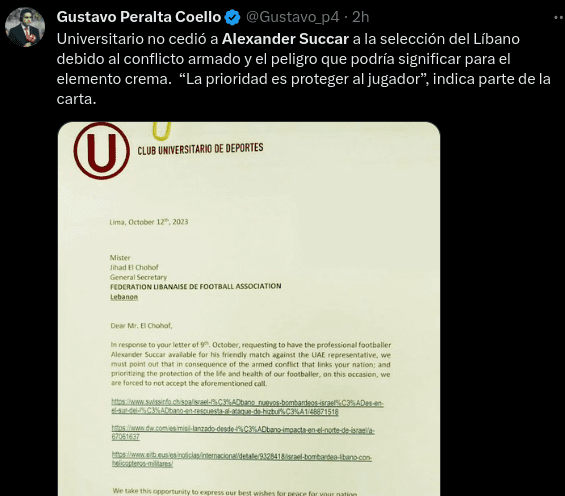 “Universitario no cedió a Alexander Succar a la selección del Líbano debido al conflicto armado y el peligro que podría significar para el elemento crema. “La prioridad es proteger al jugador”, indica parte de la carta”, fue lo que publicó el periodista Gustavo Peralta en sus redes sociales.