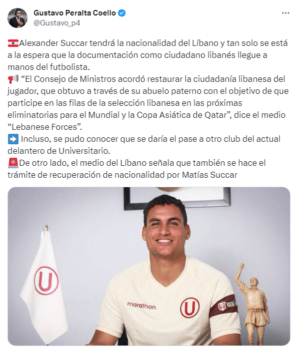 “Alexander Succar tendrá la nacionalidad del Líbano y tan solo se está a la espera que la documentación como ciudadano libanés llegue a manos del futbolista…De otro lado, el medio del Líbano señala que también se hace el trámite de recuperación de nacionalidad por Matías Succar”, pudo dar a conocer Gustavo Peralta en la plataforma X, de igual forma el medio Lebanese Forces colocó sobre el jugador: “El Consejo de Ministros acordó restaurar la ciudadanía libanesa del jugador, que obtuvo a través de su abuelo paterno con el objetivo de que participe en las filas de la selección libanesa en las próximas eliminatorias para el Mundial y la Copa Asiática de Qatar”, explicó.