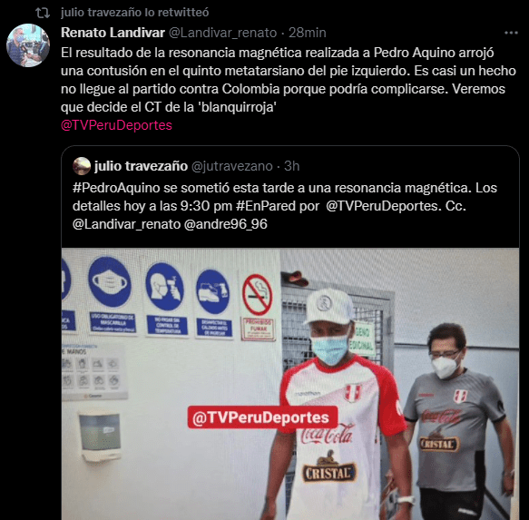 Según se pudo conocer mediante el periodista Renato Landivar, el jugador Pedro Aquino la tendría muy difícil para llegar al choque frente a Colombia, esto debido a una contusión en el quinto metatarsiano del pie izquierdo, lo cual tendrá que analizarme muy detenidamente si vale la pena arriesgarlo o no.
