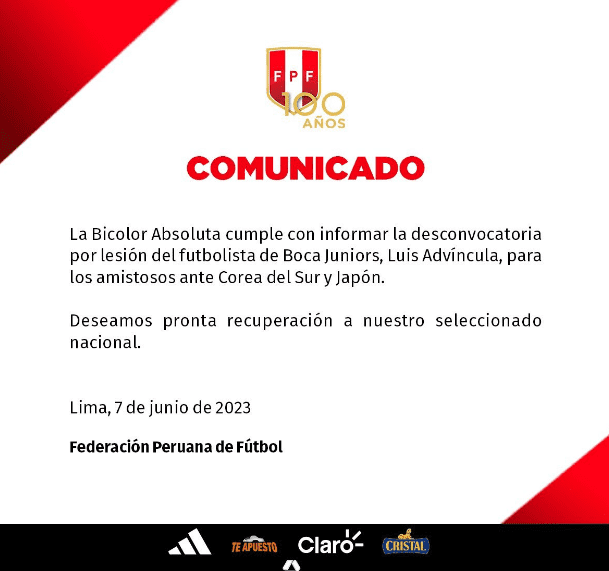 Eso sí, va a tener a una baja de peso, se trata de Luis Advíncula quien se perderá estos juegos amistosos, esto debido a una lesión que sufrió en el último partido de Boca Juniors, el futbolista siguió jugando el partido y todo indica que no podría más para lo que serán los juegos que tendrá la Selección Peruana, un gran golpe en estos momentos para el cuadro patrio, que ya tiene 2 ausencias importantes.