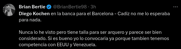 Viendo el caso de Alexander Robertson, se debería buscar la convocatoria de Diego Kochen lo más pronto posible a la Selección Peruana. “Diego Kochen en la banca para el Barcelona - Cadiz no me lo esperaba para nada. Nunca lo he visto pero tiene talla para ser arquero y parece ser bien considerado. Si es bueno yo lo convocaría ya porque también tenemos competencia con EEUU y Venezuela”, explicó en sus redes el scout Brian Bertie.