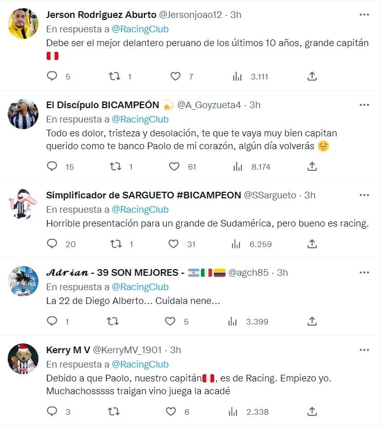 Dicho dorsal lo llegaron a utilizar jugadores de la jerarquía de Diego Milito, Lautaro Martínez, Carlos el ‘Chanchi’ Estévez, entre otros delanteros. Ahora bien, con ello en cuenta cabe preguntarse: ¿Cómo se pronunciaron los hinchas de la ‘Acade’ sobre la confirmación del fichaje de Guerrero? La mayoría de hinchas le ha deseado la mayor de las suertes a PG9. Mientras tanto, otros son hinchas de Alianza Lima que aparentemente resentidos han ido a comentar el post en las redes sociales de Racing. Otros por su parte, han señalado que el ariete nacional no se encuentra en las condiciones para jugar en el fútbol argentino.