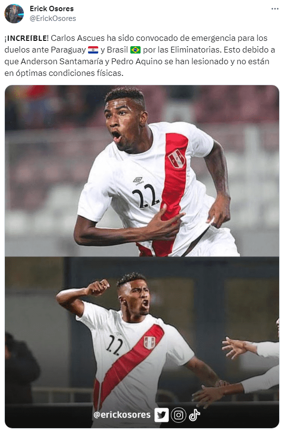 Con este llamado la prensa no podía dejar de hablar y esto fue lo que dijo Erick Osores: “¡Increíble! Carlos Ascues ha sido convocado de emergencia para los duelos ante Paraguay y Brasil por las Eliminatorias. Esto debido a que Anderson Santamaría y Pedro Aquino se han lesionado y no están en óptimas condiciones físicas”, expresó el periodista en sus redes sociales.