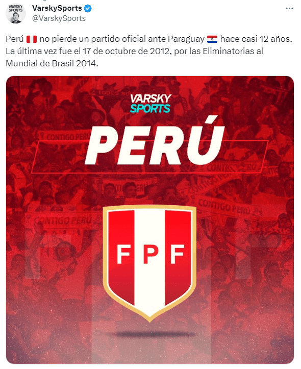 “Perú no pierde un partido oficial ante Paraguay hace casi 12 años. La última vez fue el 17 de octubre de 2012, por las Eliminatorias al Mundial de Brasil 2014”, fue lo que mencionó Juan Pablo Varsky sobre la Selección Peruana que sigue teniendo buenos partidos contra el cuadro de Paraguay, que hace años no sabe que es ganar un solo encuentro ante Perú.