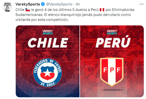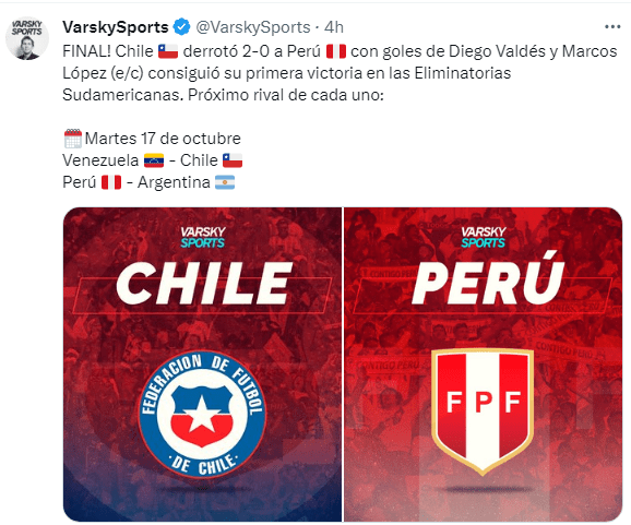 A es así como Juan Pablo Varsky no podía dejar de opinar sobre lo que fue este encuentro, con lo cual dijo lo siguiente: “FINAL! Chile derrotó 2-0 a Perú con goles de Diego Valdés y Marcos López (e/c) consiguió su primera victoria en las Eliminatorias Sudamericanas”, pero no fue lo único, pues agregó: “Chile le ganó 4 de los últimos 5 duelos a Perú por Eliminatorias Sudamericanas. El elenco blanquirrojo jamás pudo derrotarlo como visitante por esta competición”, sentenció el periodista argentino.