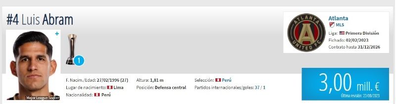 Cabe precisar que tanto Abram (Atlanta United) como Cartagena (Orlando City) valen en el mercado internacional 3 millones y 2,50 millones de euros, respectivamente. Sumado estas dos cifras, sale un total de 5,5 millones de euros, lo que al cambio en soles vendría a ser aproximadamente un poco más de S/22 millones.