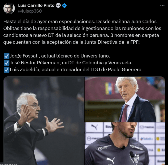 “Hasta el día de ayer eran especulaciones. Desde mañana Juan Carlos Oblitas tiene la responsabilidad de ir gestionando las reuniones con los candidatos a nuevo DT de la selección peruana. 3 nombres en carpeta que cuentan con la aceptación de la Junta Directiva de la FPF”, se pudo conocer que ya tienen opciones reales en la FPF, según lo que ha dado a conocer Luis Carrillo Pinto en sus redes sociales hasta ahora.